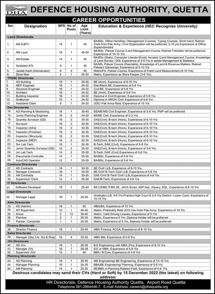 Defence Housing Authority Quetta DHA Jobs 2022 announce the Contract career opportunities for the post of See Below Ad in Balochistan, Quetta for the fresh and experienced candidates on Contract basis who have Check Advertisement degree. Posted date of this post is 05/12/2022 and the last date is 15/12/2022. if you are eligible for this job apply before due date.