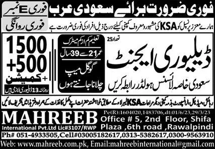 Delivery Agent Jobs Open In Saudi Arabia 2023 announce the Contract career opportunities for the post of See Below Ad in Saudi Arabia for the fresh and experienced candidates on Contract basis who have Check Advertisement degree. Posted date of this post is 26/07/2023 and the last date is 02/08/2023. if you are eligible for this job apply before due date.
