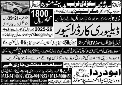 Delivery Car Driver Jobs in Saudia Arabia 2025 announce the Contract career opportunities for the post of See Below Ad in Saudi Arabia for the fresh and experienced candidates on Contract basis who have Check Advertisement degree. Posted date of this post is 09/12/2025 and the last date is 25/12/2025. if you are eligible for this job apply before due date.