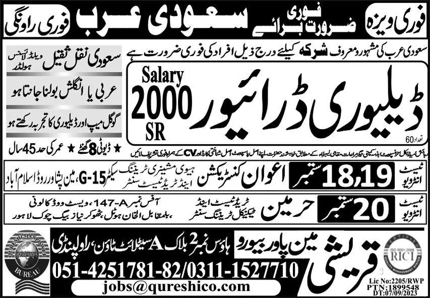 Delivery Driver & Driver Jobs 2023 In Saudi Arabia announce the Contract career opportunities for the post of See Below Ad in Saudi Arabia for the fresh and experienced candidates on Contract basis who have Check Advertisement degree. Posted date of this post is 15/09/2023 and the last date is 20/09/2023. if you are eligible for this job apply before due date.