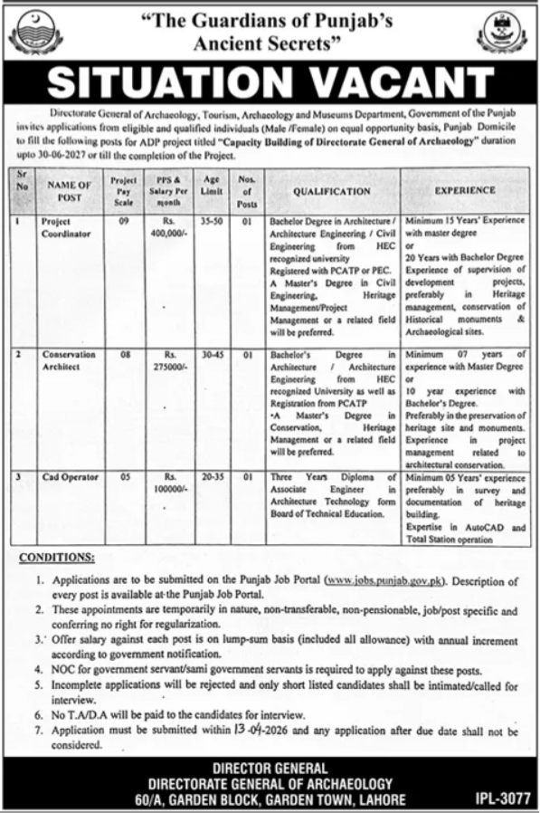 Department Of Archaeology & Museums Lahore Jobs 2026 announce the Contract career opportunities for the post of See Below Ad in Punjab, Lahore for the fresh and experienced candidates on Contract basis who have Check Advertisement degree. Posted date of this post is 28/03/2026 and the last date is 13/04/2026. if you are eligible for this job apply before due date.