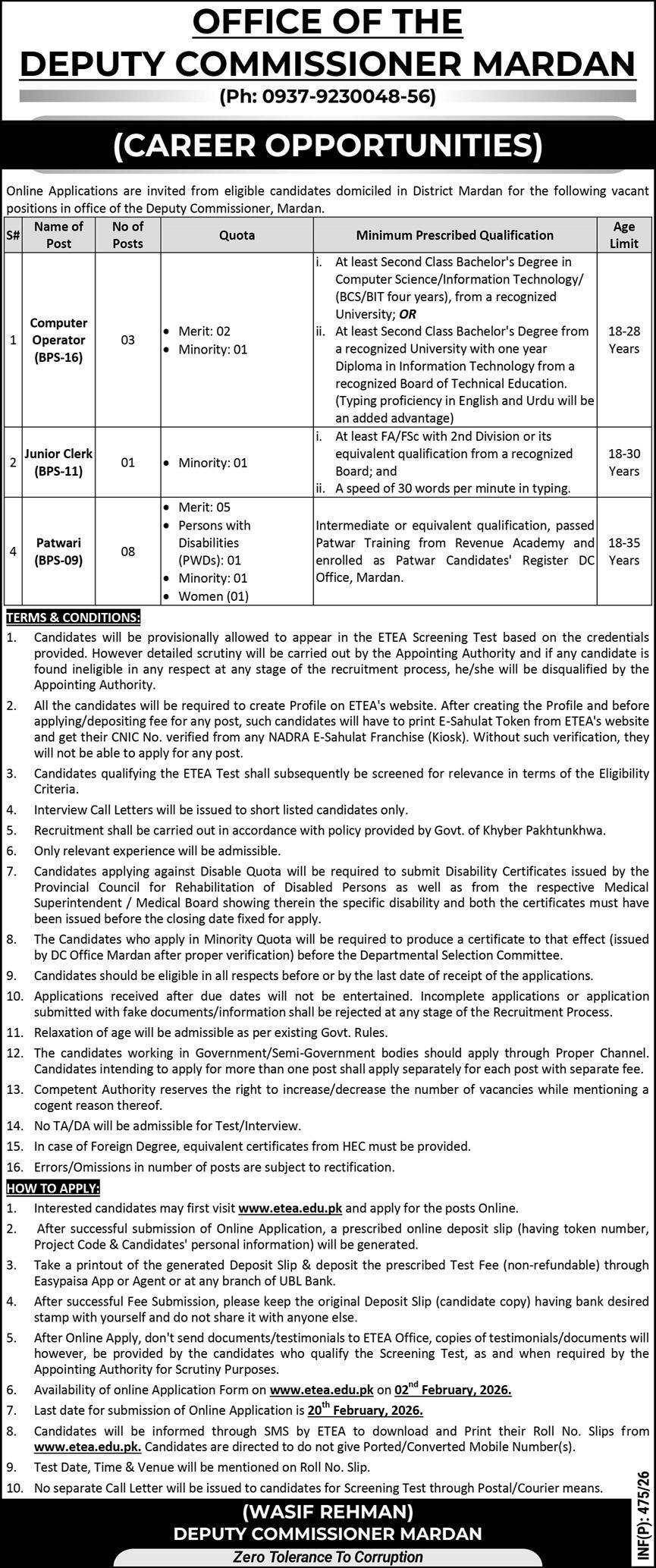 Online Applications are invited from eligible candidates domiciled in District Mardan for the following vacant positions in office of the Deputy Commissioner, Mardan.