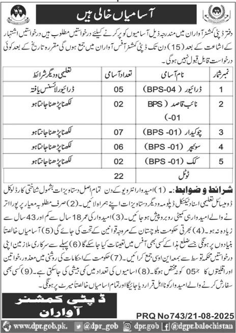Deputy Commissioner Office Awaran Jobs 2025 announce the Contract career opportunities for the post of See Below Ad in Balochistan, Awaran for the fresh and experienced candidates on Contract basis who have Check Advertisement degree. Posted date of this post is 22/08/2025 and the last date is 06/09/2025. if you are eligible for this job apply before due date.