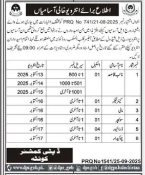 Regarding Advertisement No. PRO No. 741/21-08-2025 issued in newspapers, candidates who applied for the following positions in this office are informed that interviews will be conducted as per the schedule below at Officer's Club, Askari Road, Quetta. All candidates are requested to bring their original documents and other necessary papers on the scheduled date at 09:00 AM.