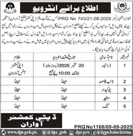 Reference to Advertisement No. PRQ No. 743/21-08-2025, under which applications were submitted by local domicile holders of Awaran district for filling the following vacancies in the office of the Deputy Commissioner, Awaran District (Revenue Department). They are hereby informed through this notice that all candidates should appear for interviews with their original documents and National Identity Card in this office according to the schedule below. No travel allowance will be given to candidates appearing for the interview.
