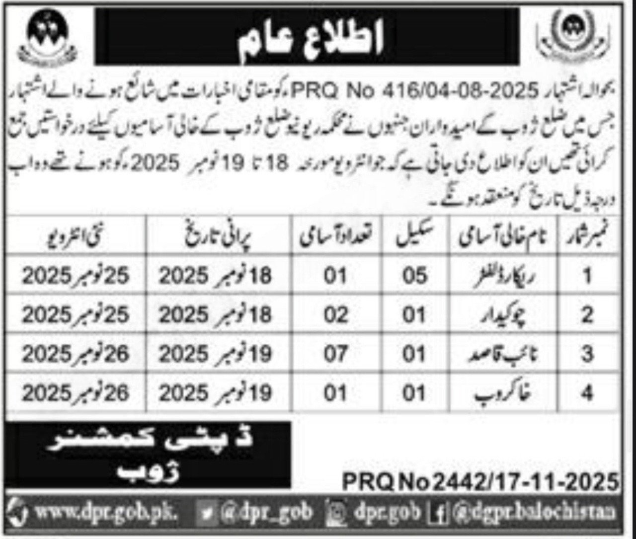 Deputy Commissioner Revenue Zhob Jobs Interview 2025 announce the Contract career opportunities for the post of See Below Ad in Balochistan, Zhob for the fresh and experienced candidates on Contract basis who have Check Advertisement degree. Posted date of this post is 21/11/2025 and the last date is 26/11/2025. if you are eligible for this job apply before due date.
