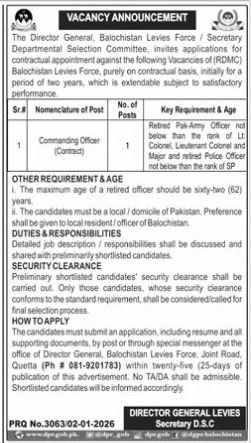 Director General Balochistan Levies Force Jobs 2026 announce the Contract career opportunities for the post of See Below Ad in Balochistan, Quetta for the fresh and experienced candidates on Contract basis who have Check Advertisement degree. Posted date of this post is 03/01/2026 and the last date is 29/01/2026. if you are eligible for this job apply before due date.