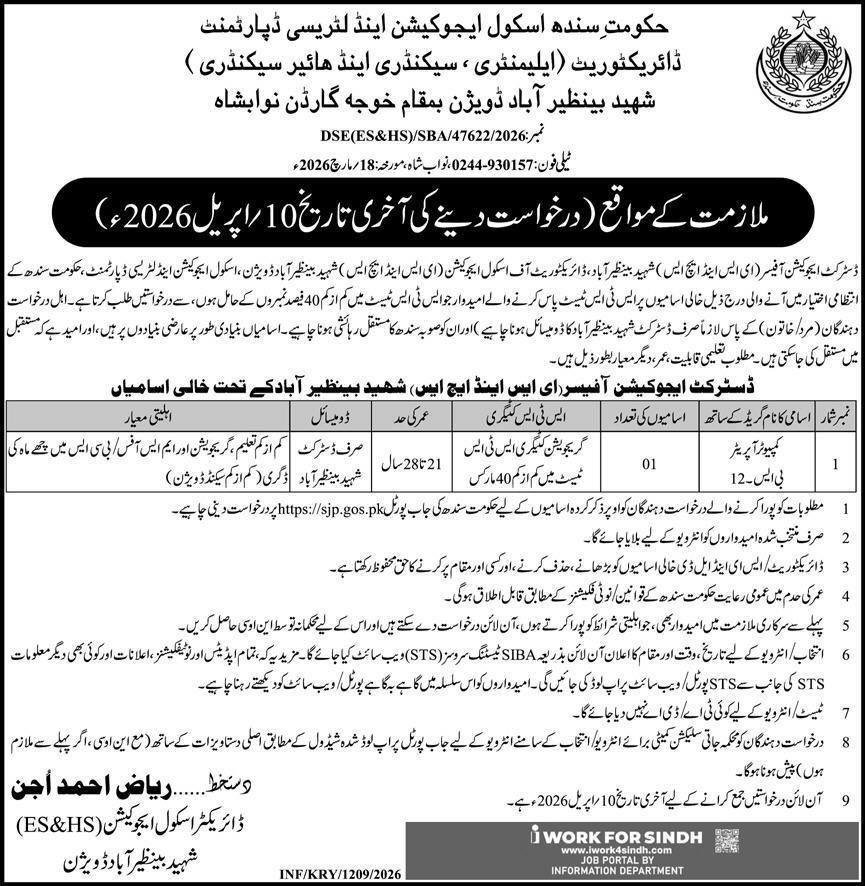 Director School Education ES&HS Shaheed Benazirabad Jobs announce the Contract career opportunities for the post of See Below Ad in Sindh, Shaheed Benazirabad for the fresh and experienced candidates on Contract basis who have Check Advertisement degree. Posted date of this post is 25/03/2026 and the last date is 10/04/2026. if you are eligible for this job apply before due date.