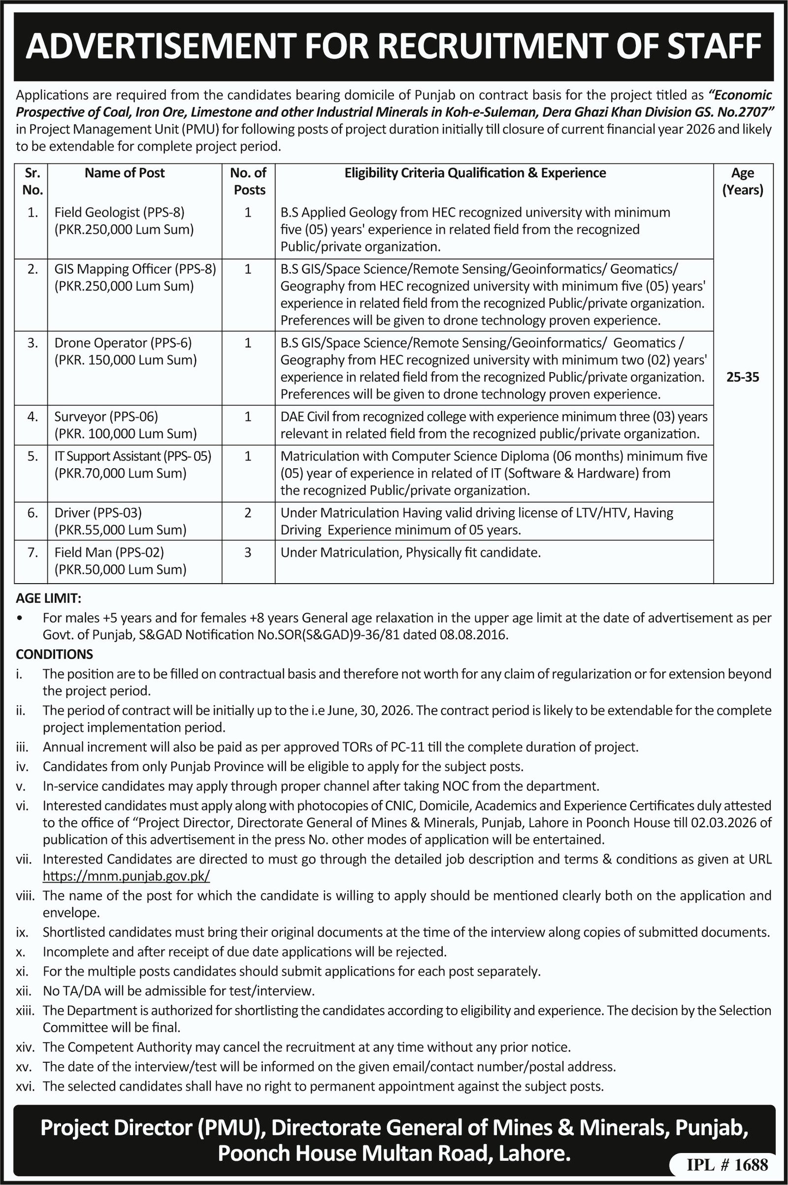Directorate General Mines & Minerals Lahore Jobs 2026 announce the Contract career opportunities for the post of See Below Ad in Punjab, Lahore for the fresh and experienced candidates on Contract basis who have Check Advertisement degree. Posted date of this post is 17/02/2026 and the last date is 02/03/2026. if you are eligible for this job apply before due date.