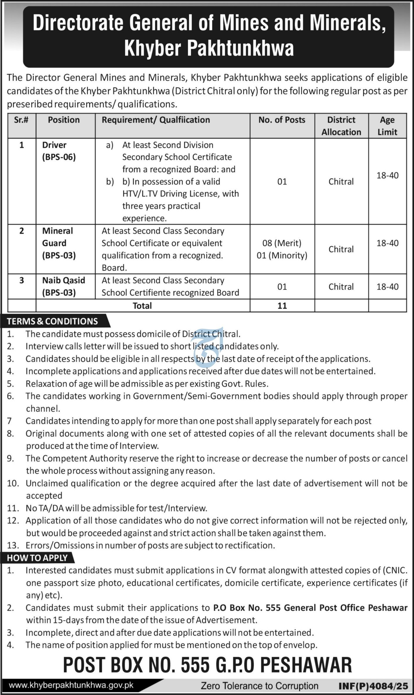 The Director General Mines and Minerals, Khyber Pakhtunkhwa seeks applications of eligible candidates of the Khyber Pakhtunkhwa (District Chitral only) for the following regular post as per prescribed requirements/qualifications.