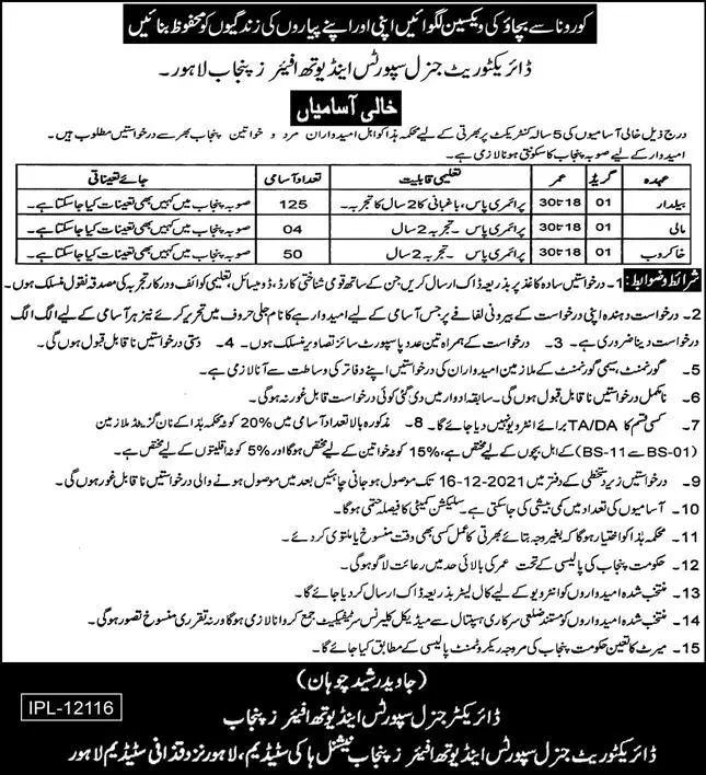 Directorate General Sports & Youth Affairs Lahore Jobs announce the Contract career opportunities for the post of See Below Ad in Punjab,Lahore for the fresh and experienced candidates on Contract basis who have Check Advertisement degree. Posted date of this post is 25/11/2021 and the last date is 16/12/2021. if you are eligible for this job apply before due date.