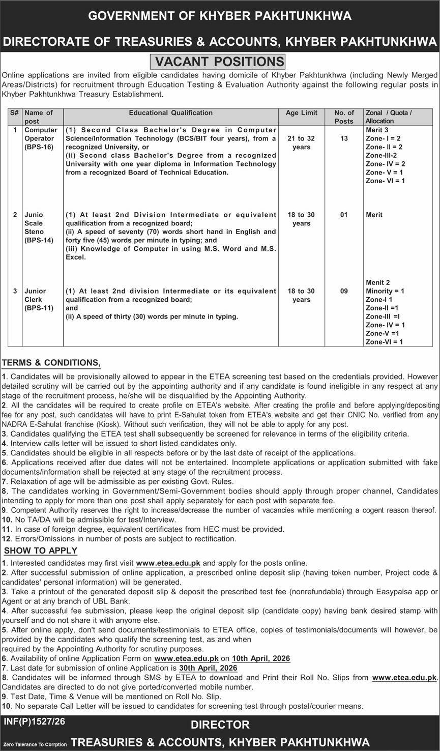 Directorate Of Treasuries & Accounts Khyber Pakhtunkhwa Jobs announce the Contract career opportunities for the post of See Below Ad in Khyber Pakhtunkhwa, Peshawar for the fresh and experienced candidates on Contract basis who have Check Advertisement degree. Posted date of this post is 09/04/2026 and the last date is 30/04/2026. if you are eligible for this job apply before due date.