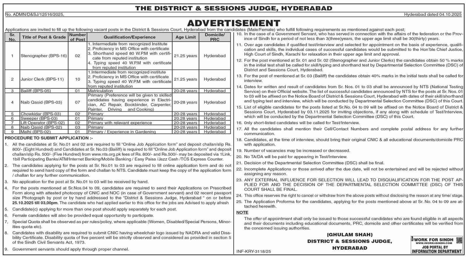 - For the posts mentioned at Sr.Nos.04 to 09, candidates are required to send their Applications on Prescribed Form along with attested photocopy of CNIC and NOC (in case of Government servant) and 02 recent passport size Photograph by post or by hand addressed to the "District & Sessions Judge, Hyderabad" on or before 25.10.2025 till 03:00pm. The candidate who had applied earlier to this office for the jobs are Advised to apply afresh.