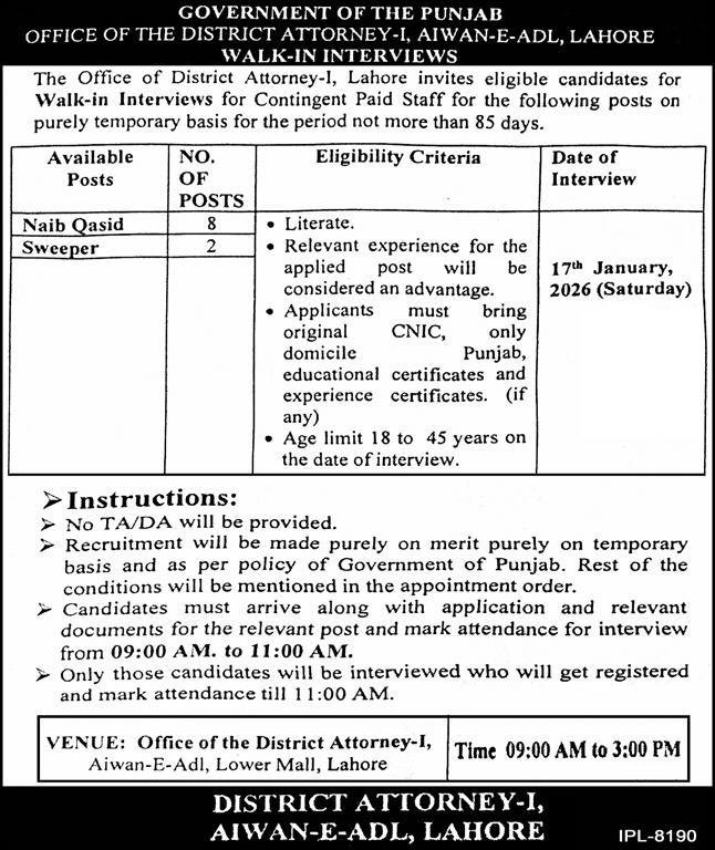 The Office of District Attorney-I, Lahore invites eligible candidates for Walk-in Interviews for Contingent Paid Staff for the following posts on purely temporary basis for the period not more than 85 days.