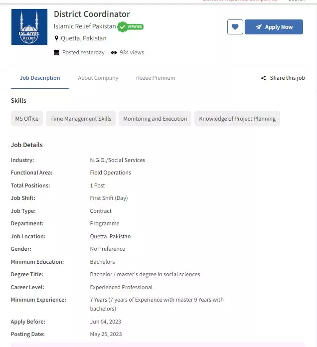 District Coordinator Islamic Relief Quetta Jobs 2023 announce the Contract career opportunities for the post of See Below Ad in Balochistan, Quetta for the fresh and experienced candidates on Contract basis who have Check Advertisement degree. Posted date of this post is 26/05/2023 and the last date is 03/06/2023. if you are eligible for this job apply before due date.