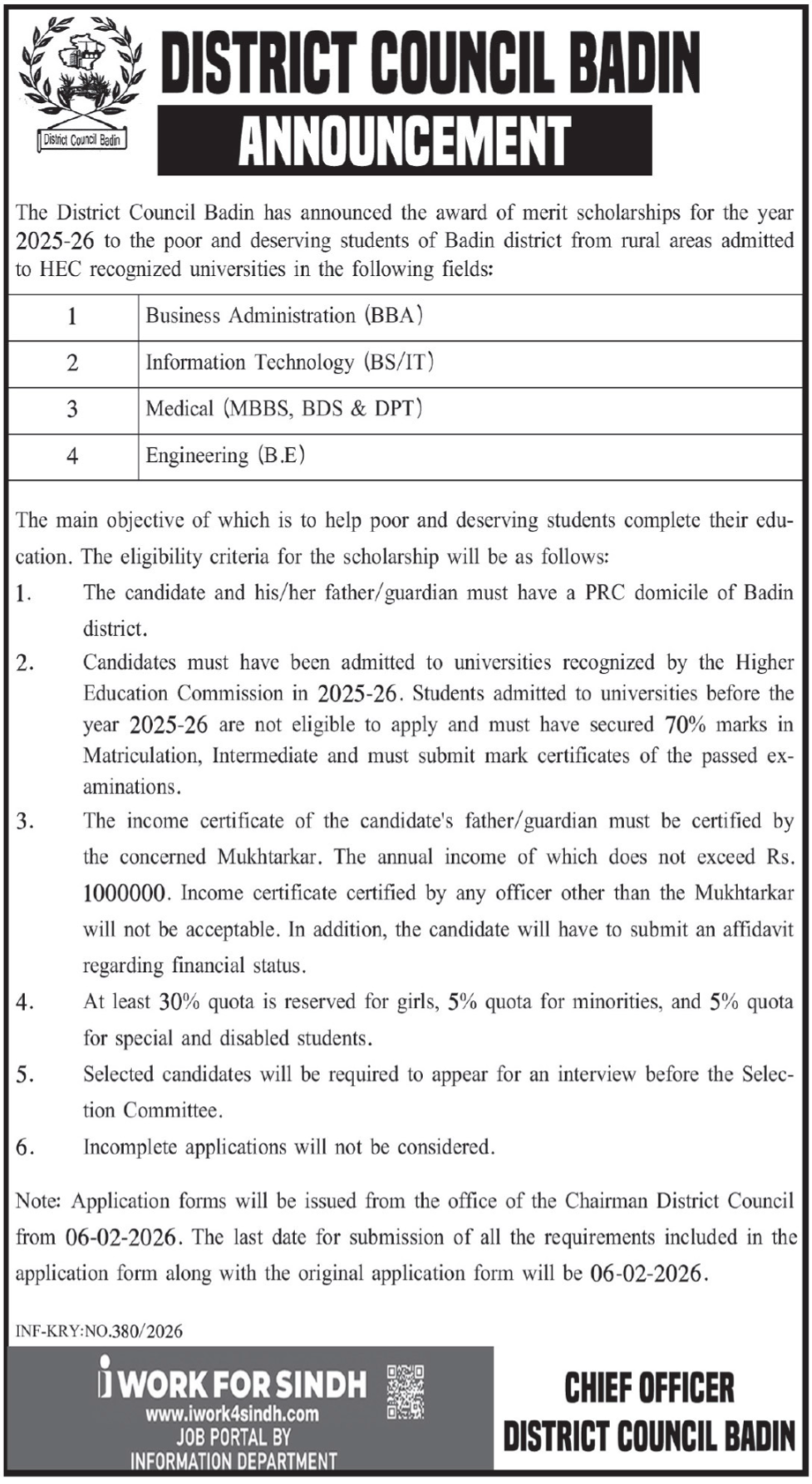 The District Council Badin has announced the award of merit scholarships for the year 2025-26 to the poor and deserving students of Badin district from rural areas admitted to HEC recognized universities in the following fields: