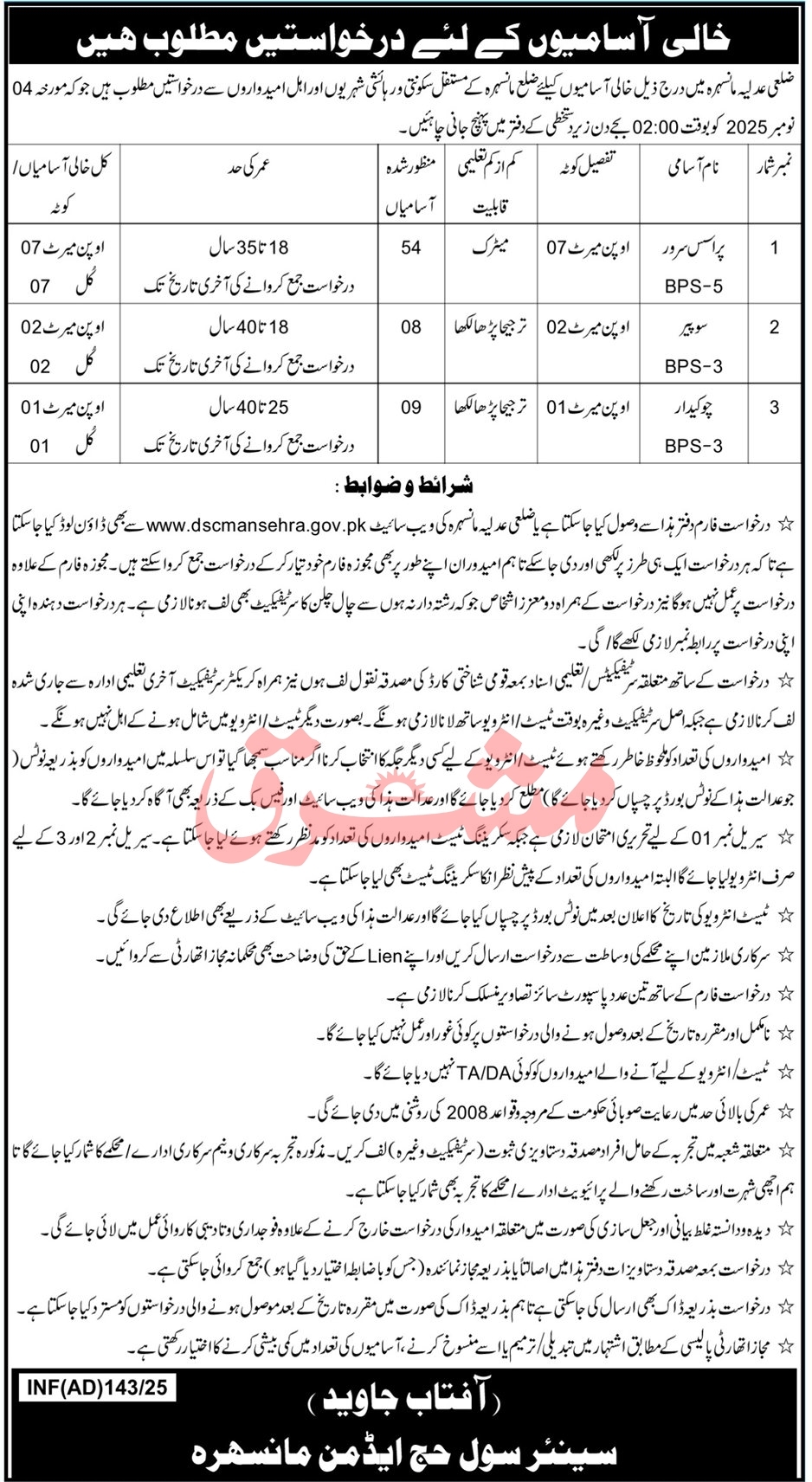 Applications are required for the following vacant posts in the District Judiciary Mansehra from permanent residents and eligible candidates of District Mansehra, which must reach the office of the undersigned by 02:00 PM on 04 November 2025.