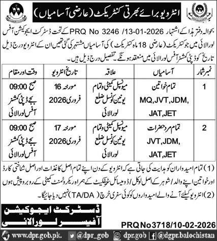 District Education Officer DEO Loralai Jobs Interview 2026 announce the Contract career opportunities for the post of See Below Ad in Balochistan, Loralai for the fresh and experienced candidates on Contract basis who have Check Advertisement degree. Posted date of this post is 11/02/2026 and the last date is 17/02/2026. if you are eligible for this job apply before due date.