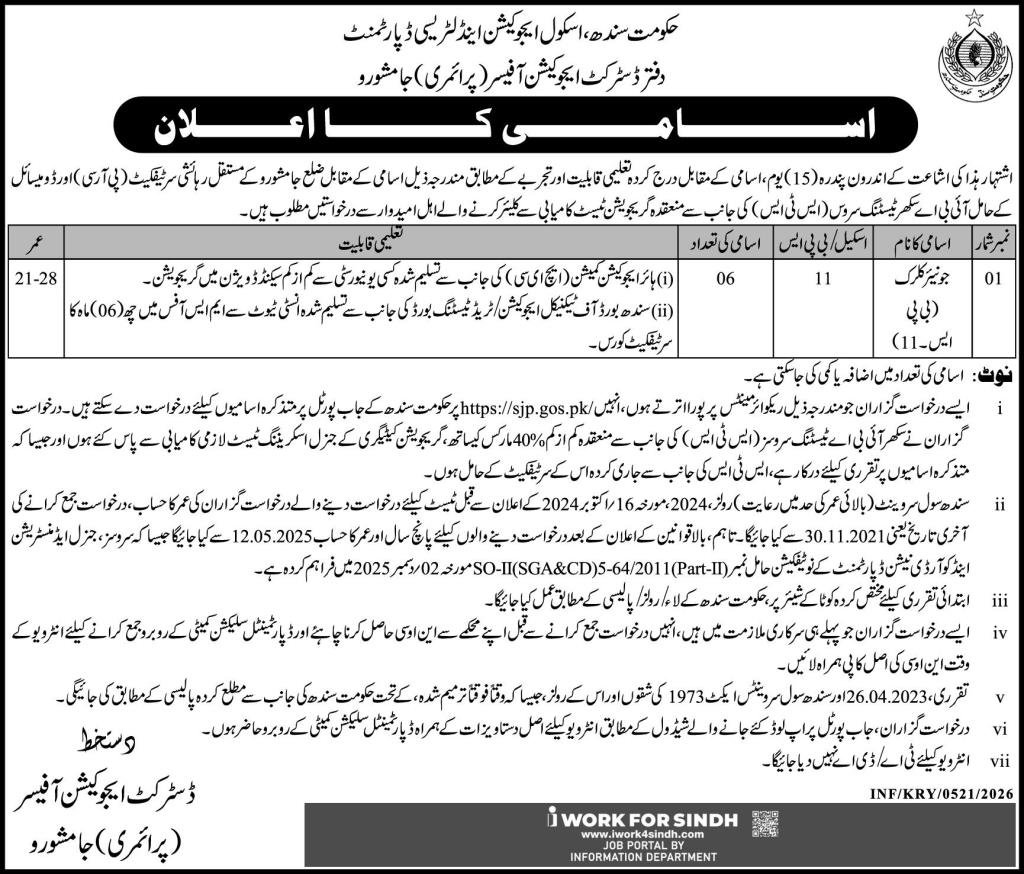 District Education Officer Primary Jamshoro Jobs 2026 announce the Contract career opportunities for the post of See Below Ad in Sindh, Jamshoro for the fresh and experienced candidates on Contract basis who have Check Advertisement degree. Posted date of this post is 13/02/2026 and the last date is 28/02/2026. if you are eligible for this job apply before due date.