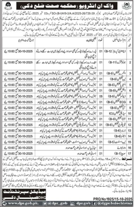 District Headquarter Hospital DHQ Duki Jobs Interview 2025 announce the Contract career opportunities for the post of See Below Ad in Balochistan, Duki for the fresh and experienced candidates on Contract basis who have Check Advertisement degree. Posted date of this post is 16/10/2025 and the last date is 30/10/2025. if you are eligible for this job apply before due date.