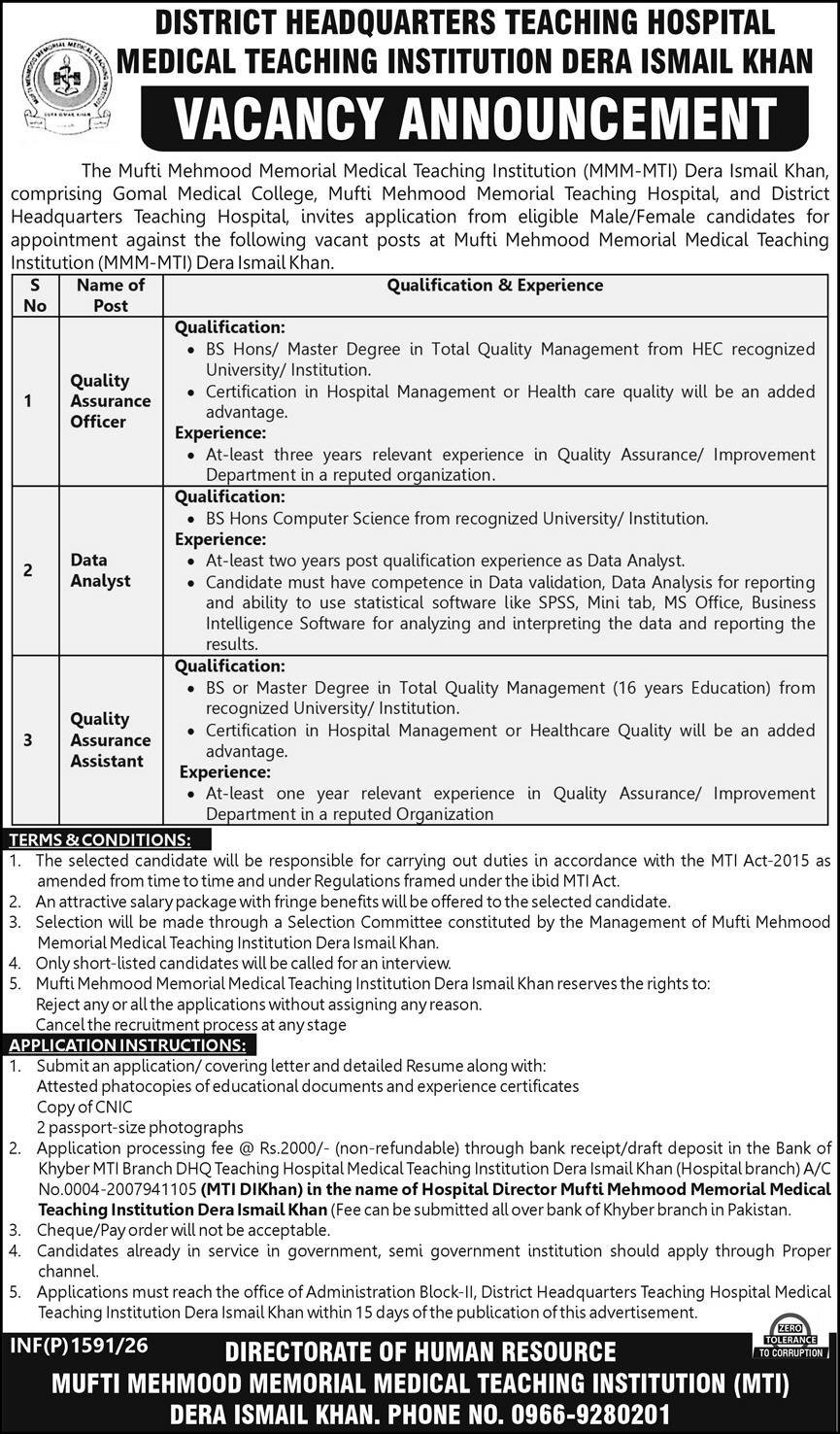 The Mufti Mehmood Memorial Medical Teaching Institution (MMM-MTI) Dera Ismail Khan, comprising Gomal Medical College, Mufti Mehmood Memorial Teaching Hospital, and District Headquarters Teaching Hospital, invites application from eligible Male/Female candidates for appointment against the following vacant posts at Mufti Mehmood Memorial Medical Teaching Institution (MMM-MTI) Dera Ismail Khan.