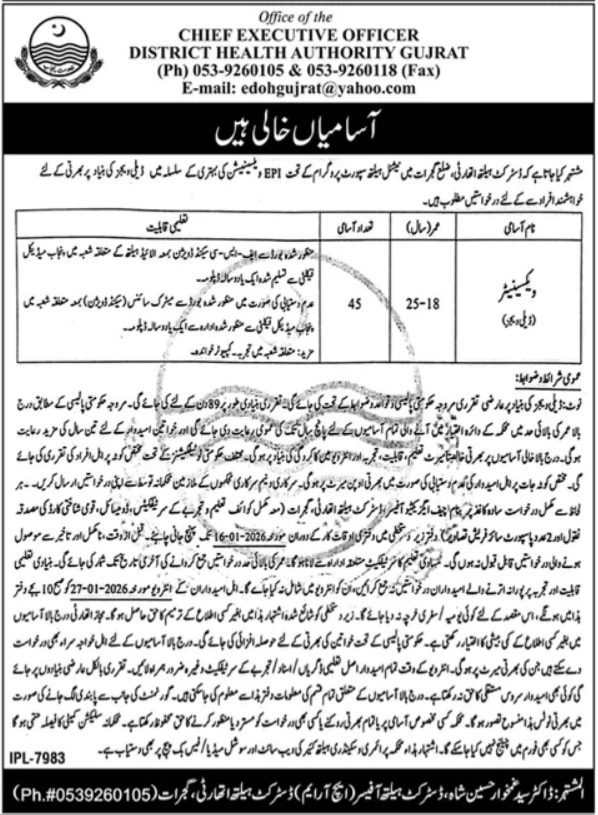 - Complete applications in all respects on plain paper addressed to the Chief Executive Officer, District Health Authority, Gujrat (along with complete particulars, attested copies of educational and experience certificates, domicile, national identity card, and 2 fresh passport size photographs) must reach the undersigned office during office hours by 16-01-2026.