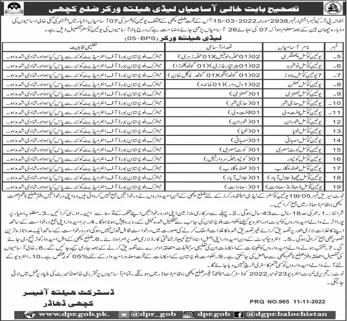 District Health officer Kachi Dahadar Jobs 2022 announce the Contract career opportunities for the post of See Below Ad in Balochistan, Dhader for the fresh and experienced candidates on Contract basis who have Check Advertisement degree. Posted date of this post is 12/11/2022 and the last date is 23/11/2022. if you are eligible for this job apply before due date.