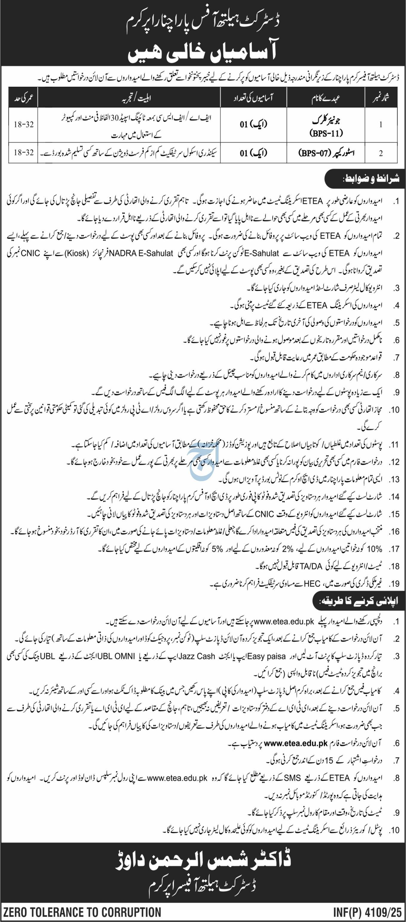 Applications are invited online from candidates belonging to Khyber Pakhtunkhwa to fill the following vacant positions under the supervision of District Health Officer Kurram Parachinar.