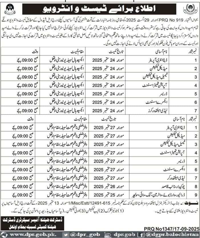 Reference Advertisement No. PRQ 919 dated August 29, 2025, published in local daily newspapers, tests and interviews for the advertised positions will be held according to the following schedule. All candidates are advised to appear at the designated place and time for tests and interviews. No travel allowance will be paid for interviews, and candidates who do not appear will be rejected. Candidates appearing for the test should bring their pen and examination board/clipboard with them. Participation in the test and interview will not be allowed without the original CNIC. Mobile phones, calculators, and any other devices are not allowed during the test.