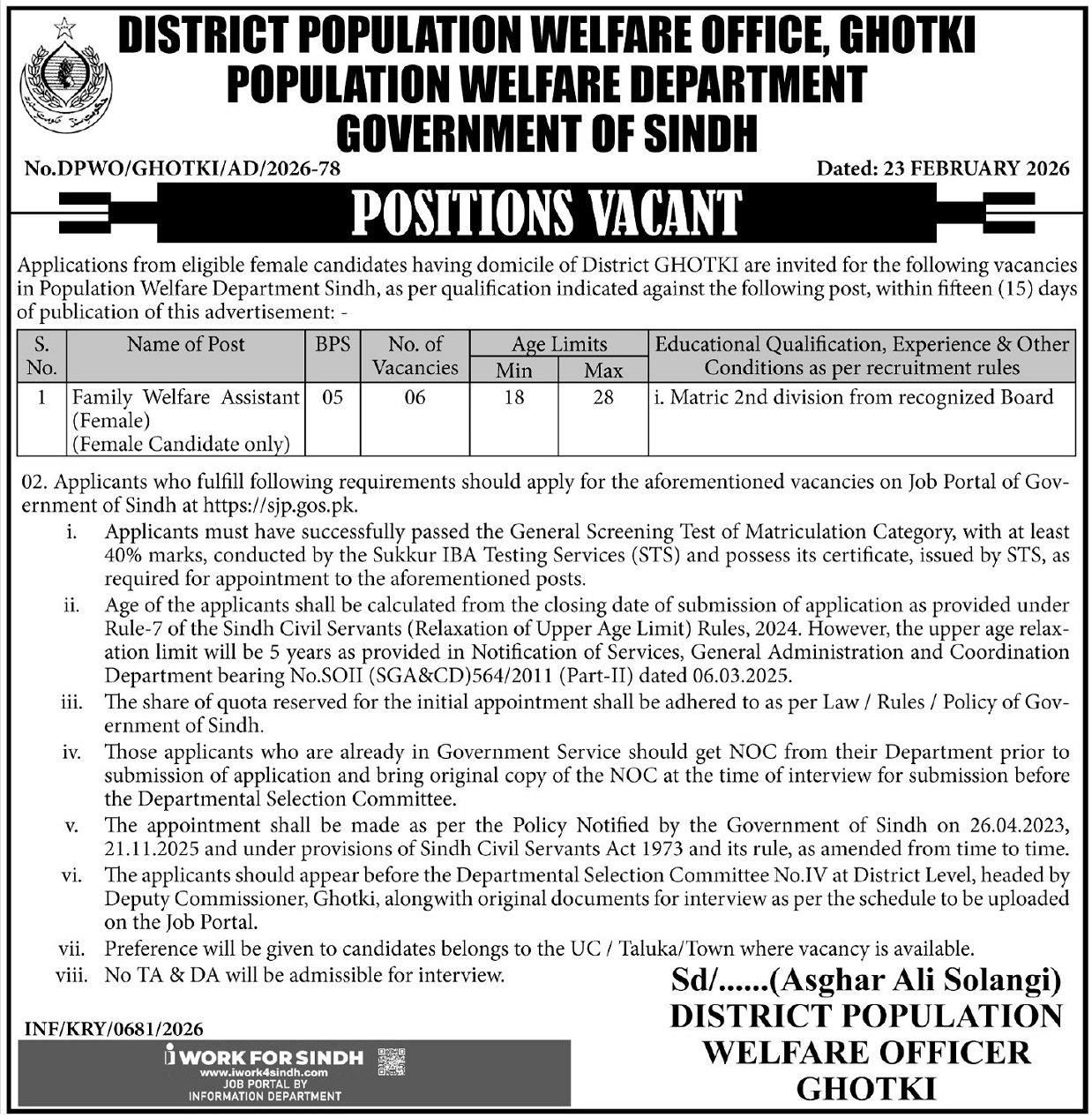 District Population Welfare Officer Ghotki Jobs 2026 announce the Contract career opportunities for the post of See Below Ad in Sindh, Ghotki for the fresh and experienced candidates on Contract basis who have Check Advertisement degree. Posted date of this post is 25/02/2026 and the last date is 11/03/2026. if you are eligible for this job apply before due date.