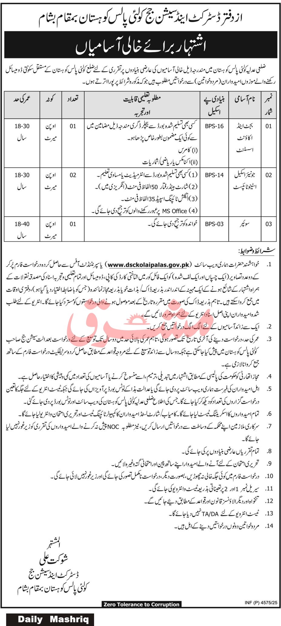 Applications are invited from suitable candidates (male and female) with a permanent domicile of District Kolai-Palas Kohistan for temporary appointments to the following vacant positions in the District Judiciary of Kolai-Palas Kohistan, who meet the mentioned terms and conditions.