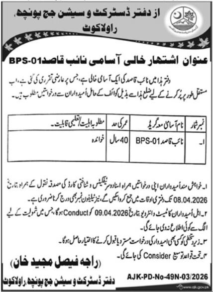 District & Session Judge Rawalakot Job Notice 2026 announce the Contract career opportunities for the post of See Below Ad in Azad Jammu Kashmir, Rawla Kot for the fresh and experienced candidates on Contract basis who have Check Advertisement degree. Posted date of this post is 27/03/2026 and the last date is 09/04/2026. if you are eligible for this job apply before due date.