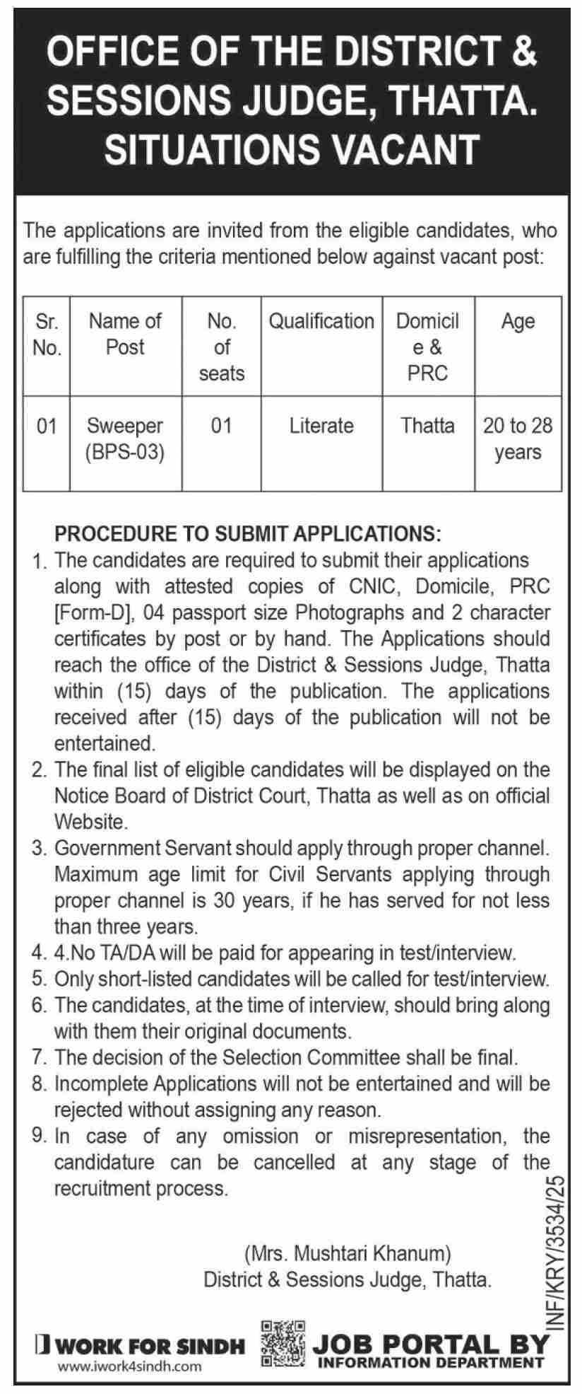 - The candidates are required to submit their applications along with attested copies of CNIC, Domicile, PRC [Form-D], 04 passport size Photographs and 2 character certificates by post or by hand. The Applications should reach the office of the District & Sessions Judge, Thatta within (15) days of the publication. The applications received after (15) days of the publication will not be entertained.