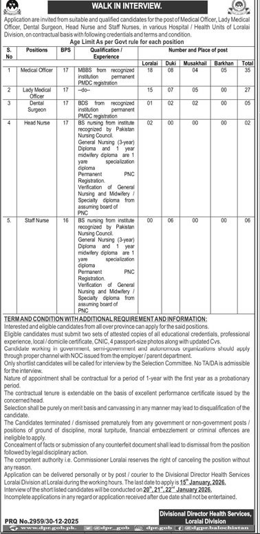 Divisional Director Health Services Loralai Jobs 2026 announce the Contract career opportunities for the post of See Below Ad in Balochistan,Loralai for the fresh and experienced candidates on Contract basis who have Check Advertisement degree. Posted date of this post is 31/12/2025 and the last date is 15/01/2026. if you are eligible for this job apply before due date.