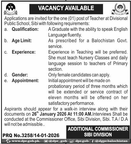 Applications are invited for the one (01) post of Teacher at Divisional Public School, Sibi with following requirements: