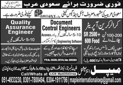 Document Control Engineer & Quality Assurance Engineer Jobs announce the Contract career opportunities for the post of See Below Ad in Saudi Arabia for the fresh and experienced candidates on Contract basis who have Check Advertisement degree. Posted date of this post is 13/03/2024 and the last date is 20/03/2024. if you are eligible for this job apply before due date.