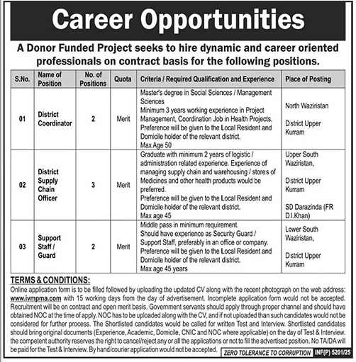 Donor Funded Project Waziristan Jobs 2025 announce the Contract career opportunities for the post of See Below Ad in Khyber Pakhtunkhwa, Wazirabad for the fresh and experienced candidates on Contract basis who have Check Advertisement degree. Posted date of this post is 09/12/2025 and the last date is 25/12/2025. if you are eligible for this job apply before due date.