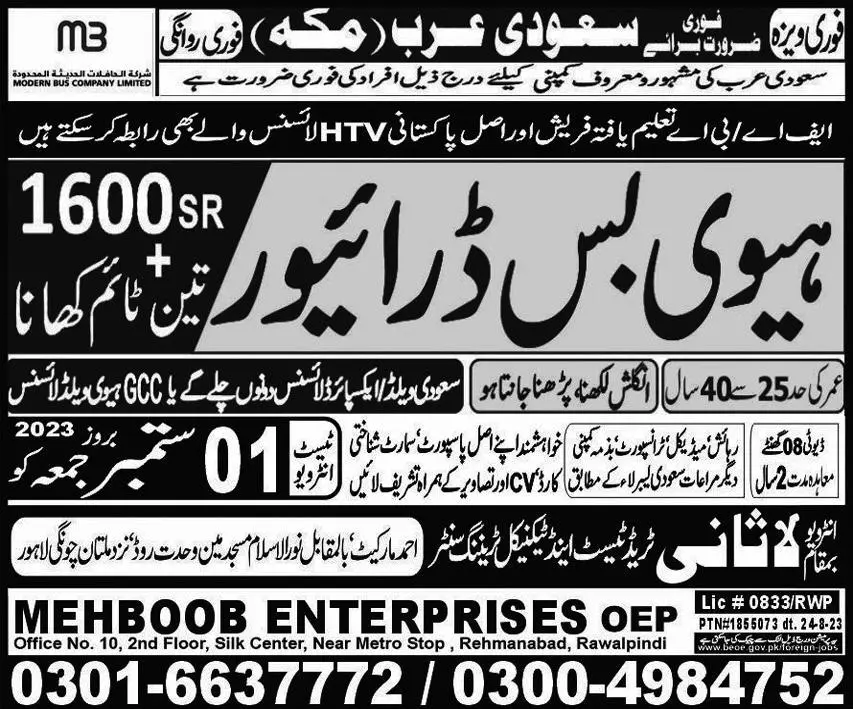 Driver & Heavy Bus Driver Jobs 2023 In Saudi Arabia announce the Contract career opportunities for the post of See Below Ad in Saudi Arabia for the fresh and experienced candidates on Contract basis who have Check Advertisement degree. Posted date of this post is 30/08/2023 and the last date is 01/09/2023. if you are eligible for this job apply before due date.