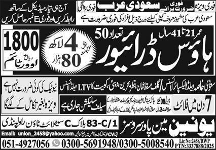 Driver & House Driver Jobs 2026 In Saudi Arabia announce the Contract career opportunities for the post of See Below Ad in Saudi Arabia for the fresh and experienced candidates on Contract basis who have Check Advertisement degree. Posted date of this post is 17/04/2026 and the last date is 25/04/2026. if you are eligible for this job apply before due date.