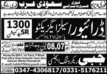 Driver & Sales Executive Jobs In Saudi Arabia 2023 announce the Contract career opportunities for the post of See Below Ad in Saudi Arabia for the fresh and experienced candidates on Contract basis who have Check Advertisement degree. Posted date of this post is 04/06/2023 and the last date is 08/06/2023. if you are eligible for this job apply before due date.