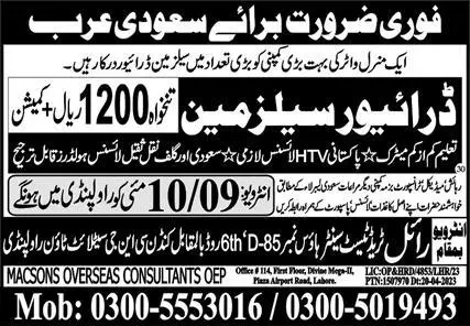 Driver Salesman & Driver Jobs 2023 In Saudi Arabia announce the Contract career opportunities for the post of See Below Ad in Saudi Arabia for the fresh and experienced candidates on Contract basis who have Check Advertisement degree. Posted date of this post is 06/05/2023 and the last date is 10/05/2023. if you are eligible for this job apply before due date.