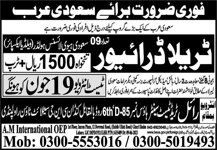 Driver & Traila Driver Jobs 2023 In Saudi Arabia announce the Contract career opportunities for the post of See Below Ad in Saudi Arabia for the fresh and experienced candidates on Contract basis who have Check Advertisement degree. Posted date of this post is 17/06/2023 and the last date is 19/06/2023. if you are eligible for this job apply before due date.