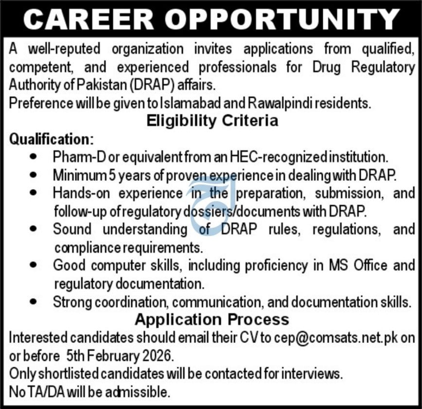 Drug Regulatory Authority Of Pakistan Islamabad Job 2026 announce the Contract career opportunities for the post of See Below Ad in Federal, Islamabad for the fresh and experienced candidates on Contract basis who have Check Advertisement degree. Posted date of this post is 27/01/2026 and the last date is 05/02/2026. if you are eligible for this job apply before due date.