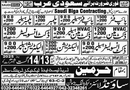 Duct Insulator & Pipe Fitter Jobs 2025 In Saudi Arabia announce the Contract career opportunities for the post of See Below Ad in Saudi Arabia for the fresh and experienced candidates on Contract basis who have Check Advertisement degree. Posted date of this post is 06/08/2025 and the last date is 14/08/2025. if you are eligible for this job apply before due date.