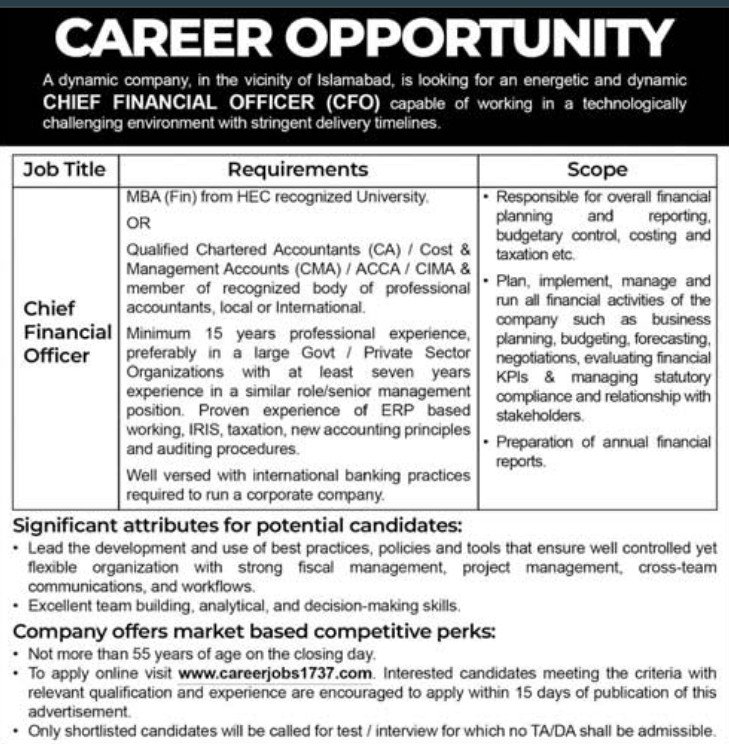 A dynamic company, in the vicinity of Islamabad, is looking for an energetic and dynamic CHIEF FINANCIAL OFFICER (CFO) capable of working in a technologically challenging environment with stringent delivery timelines.