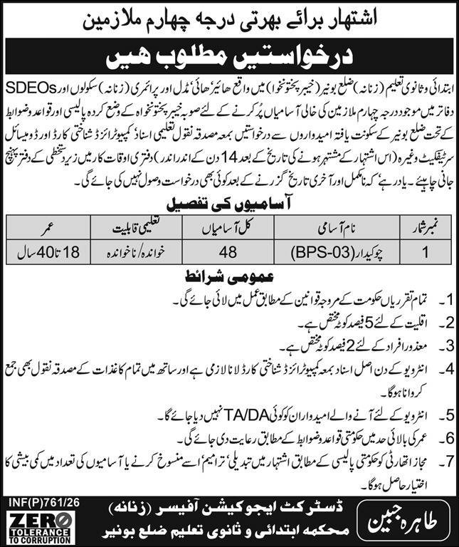 Education Department Female Buner Jobs 2026 For Chowkidar announce the Contract career opportunities for the post of See Below Ad in Khyber Pakhtunkhwa, Buner for the fresh and experienced candidates on Contract basis who have Check Advertisement degree. Posted date of this post is 19/02/2026 and the last date is 05/03/2026. if you are eligible for this job apply before due date.
