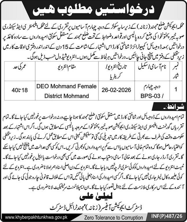 Education Department Female Mohmand Jobs 2026 announce the Contract career opportunities for the post of See Below Ad in Khyber Pakhtunkhwa, Mohmand for the fresh and experienced candidates on Contract basis who have Check Advertisement degree. Posted date of this post is 12/02/2026 and the last date is 26/02/2026. if you are eligible for this job apply before due date.