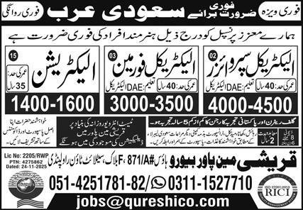 Electrical Supervisor & Electrical Foreman Jobs 2025 announce the Contract career opportunities for the post of See Below Ad in Saudi Arabia for the fresh and experienced candidates on Contract basis who have Check Advertisement degree. Posted date of this post is 05/12/2025 and the last date is 12/12/2025. if you are eligible for this job apply before due date.