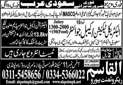 Electrical Technician & Cable Jointer Jobs 2023 Saudi Arabia announce the Contract career opportunities for the post of See Below Ad in Saudi Arabia for the fresh and experienced candidates on Contract basis who have Check Advertisement degree. Posted date of this post is 25/08/2023 and the last date is 01/09/2023. if you are eligible for this job apply before due date.