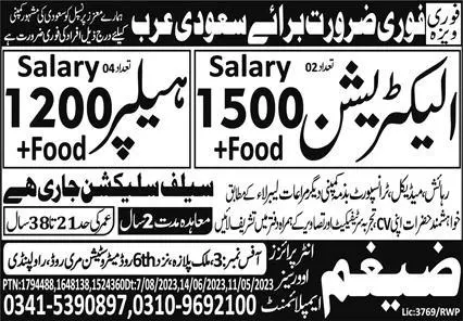 Electrician And Helper Jobs In Saudi Arabia 2023 announce the Contract career opportunities for the post of See Below Ad in Saudi Arabia for the fresh and experienced candidates on Contract basis who have Check Advertisement degree. Posted date of this post is 11/08/2023 and the last date is 11/09/2023. if you are eligible for this job apply before due date.